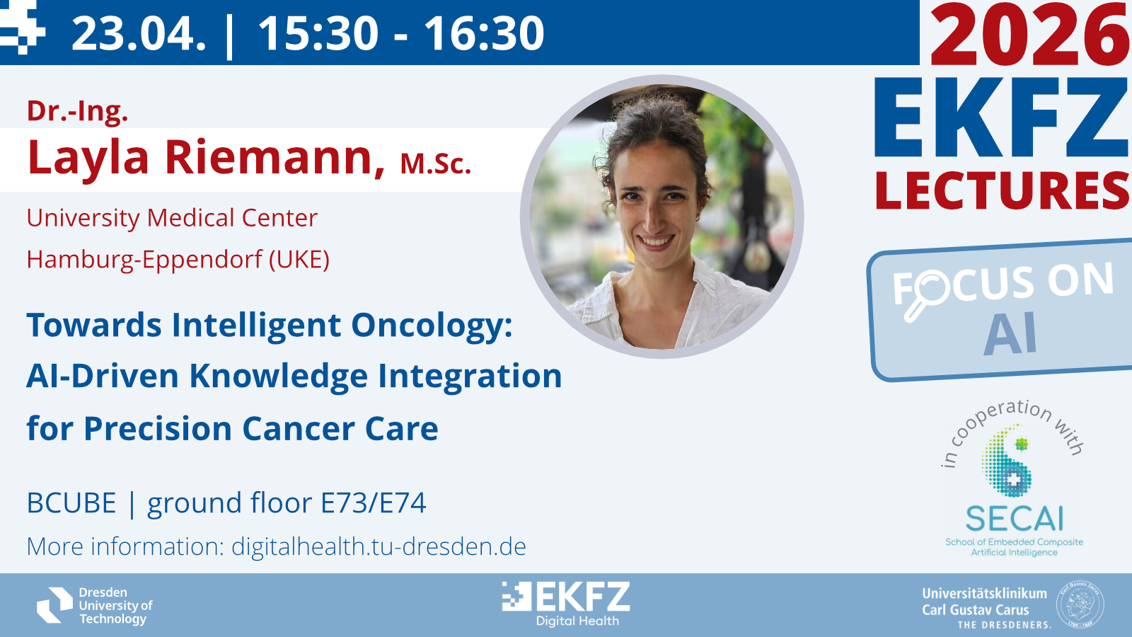 In this talk, Dr. Riemann presents several complementary research initiatives aimed at building an ecosystem for Intelligent Oncology. A central component is the Knowledge Connector (KC), a clinical decision support system that structures evidence into Blocks of Clinical Knowledge (BoCKs), modular units linking biomarkers, molecular alterations, and clinical entities to treatment effects. To keep this knowledge base current, their research team developed AI pipelines using fine-tuned BERT models for automated literature prospecting, biomedical concept extraction, and evidence-level classification. Representing these data as a semantic knowledge graph enables advanced reasoning, including similarity discovery across tumor types and the identification of potential off-label treatments or clinical trials.